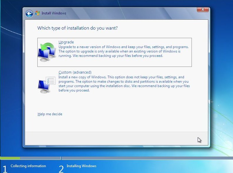 Now the "Type of installation". Click on "Custom (Advanced) to continue..