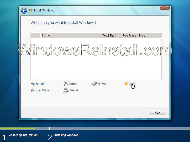 Drive Options Menu: Click "Next" to continue the install on your freshly erased (Formated) Partition (Hard drive)