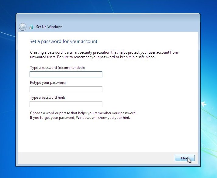 ....fill in the password box, retype to confirm, and leave yourself a hint incase it become forgotten. Click "Next to continue.