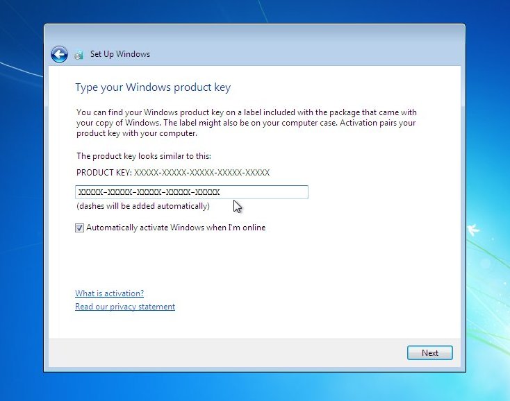 Input key (Dashes will be added automatically), "Automatically activate Windows when online" option is selected by default, deselect if you wish, and then click next to continue.