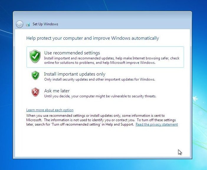 Now the built in Windows protection modes. We would recommend the top option "Use Recommended settings", this will enable updates to be downloaded and reinstalled, click on your selection too continue.